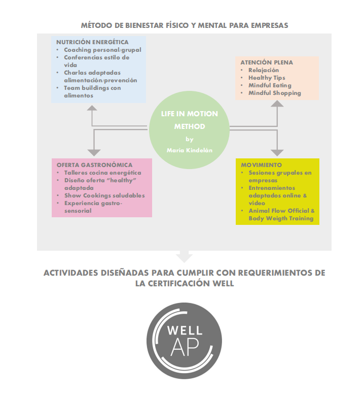 A través del MÉTODO LIFE IN MOTION by MK, ofrezco a las organiaciones contenidos de salud aclaratorios, así como pautas sostenibles y herramientas sencillas para nutrir el cuerpo adecuadamente, en función de las características físicas y energéticas de cada persona, su actividad laboral y cotidiana.